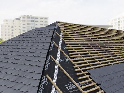 TRASPIR EVO 300 is placed parallel to the eaves line, starting from the lower edge of the roof. The second layer must be overlapped by at least 10-20 centimetres to the previous one (depending on the slope of the roof), as indicated on the layout according to UNI 11470:2013. The sheet must be applied on a continuous support with a mechanical fastening device. (ex: HAMMER STAPLER, HAND STAPLER o PNEU STAPLER). Once at the top of the roof, it is advisable for the membrane to protrude beyond the ridge line by at least 30 centimetres to ensure a perfect overlap with the strips of sheet that will overlap on the other side of the roof. It is also recommended that the sheets overlap by at least 30 cm even at the end joints. To achieve correct air and water sealing, we recommend the use of FRONT BAND UV 210, EASY BAND, SPEEDY BAND, FLEXI BAND, FLEXI BAND UV, SOLID BAND, PLASTER BAND, SMART BAND, FACADE BAND UV, FRONT BAND UV, DOUBLE BAND, SUPRA BAND, BUTYL BAND, OUTSIDE GLUE, FIRE SEALING, FIRE STRIPE.If there is an integrated double adhesive strip, it can replace the correct air and water sealing.