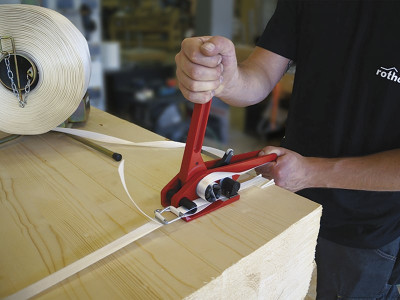 Breaking load 20% stronger than similar steel tapes, 100 % UV and weather resistant (leaves no rust or dents in the wood). Simple to load, by hand or with tensioner; the slacked tapes can be tightened again for re-use.