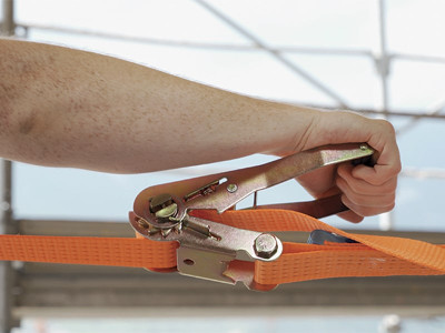 Corrosion-resistant zinc plated steel tensioner with safety lock and lever latch. Tensioning belt according to European standard EN 12195-2.